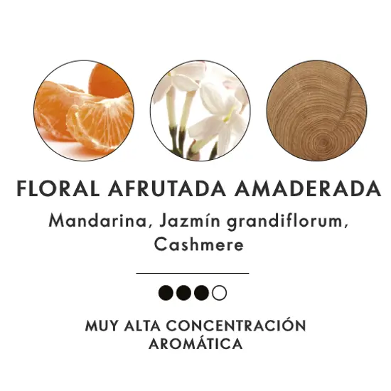 Un toque de sensualidad y elegancia, con ámbar, madera de cashmere y vainilla.