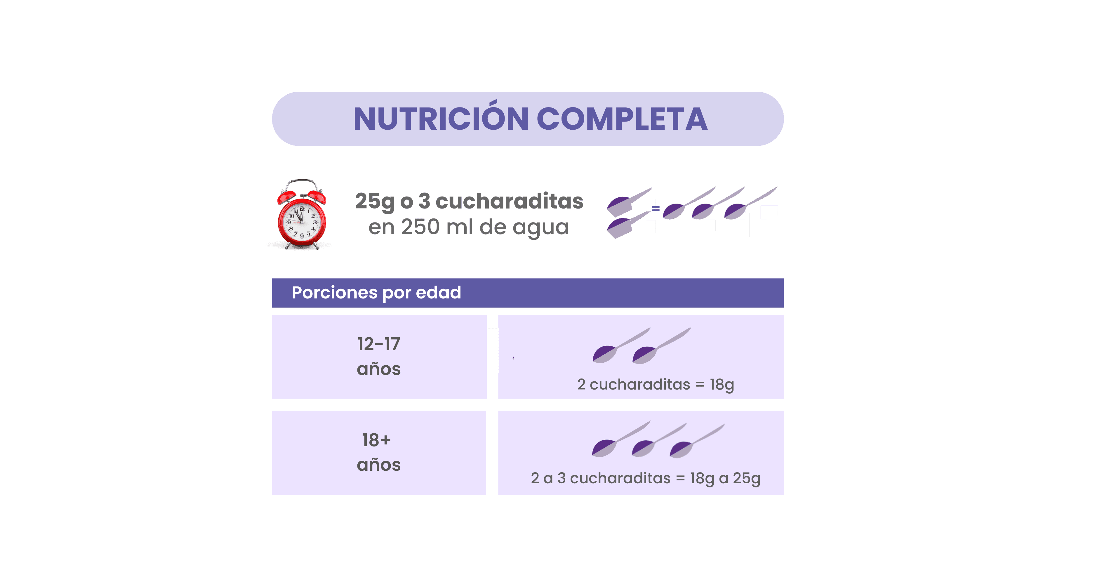 Mezclar 25g (1 porción) con 250 ml de agua, leche o bebida vegetal