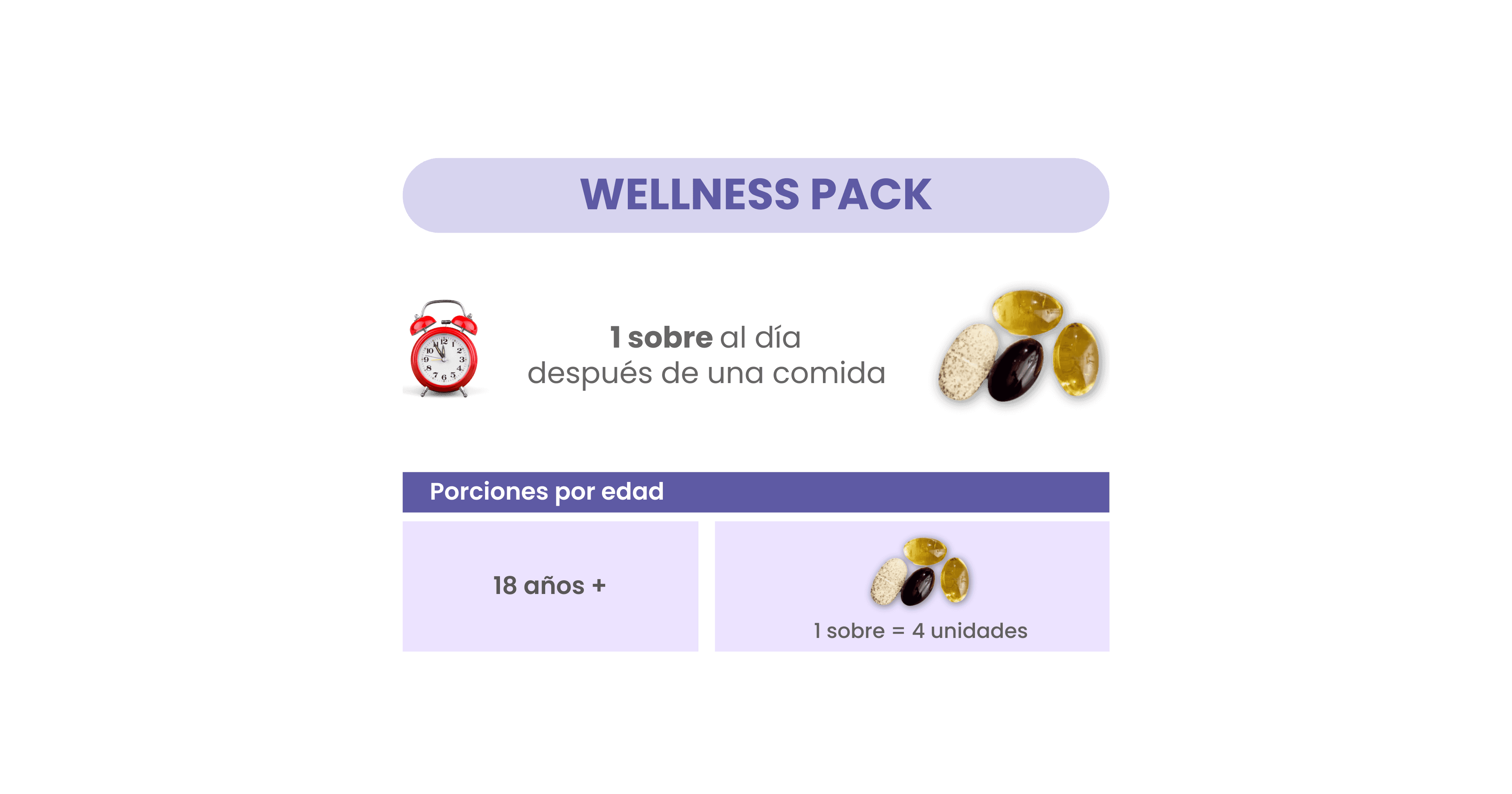 Cada sobre contiene: 1 multivitamínico para mujer o hombre, 2 cápsulas de Omega 3, 1 cápsula de Astaxantina + Arándano