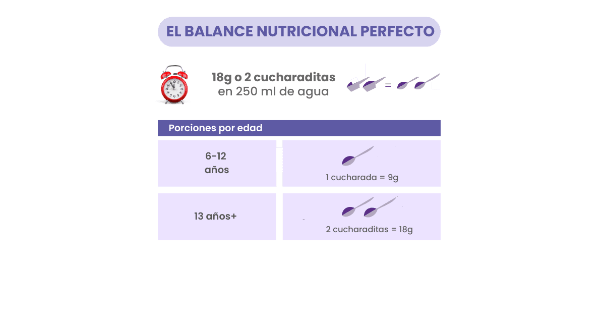 Mezclar 18g (1 porción) con 250 ml de agua, leche o bebida vegetal