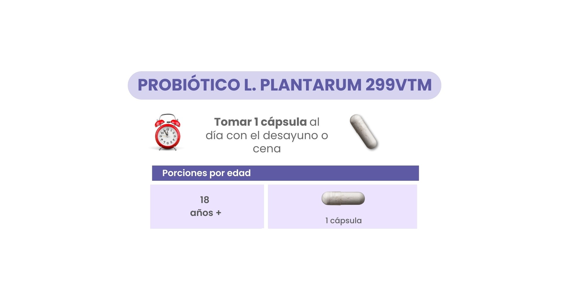 Aporta 10.000 millones de bacterias vivas de L. Plantarum 299V™, una de las cepas probióticas más estudiadas del mundo.